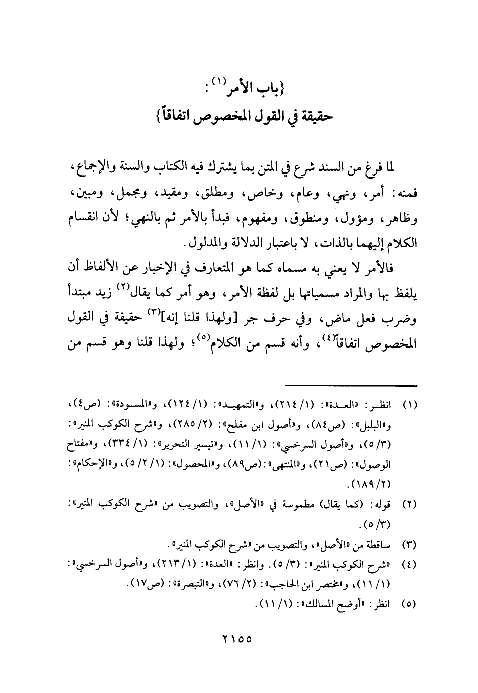لما فرغ من السَّنَد شرع فِي الْمَتْن بِمَا يشْتَرك فِيهِ الْكتاب وَالسّنة وَالْإِجْمَاع، فَمِنْهُ: أَمر، وَنهي، وعام، وخاص، وَمُطلق، ومقيد، ومجمل، ومبين، وَظَاهر، ومؤول، ومنطوق، وَمَفْهُوم، فَبَدَأَ بِالْأَمر ثمَّ بِالنَّهْي؛ لِأَن انقسام الْكَلَام إِلَيْهِمَا بِالذَّاتِ، لَا بِاعْتِبَار الدّلَالَة والمدلول.