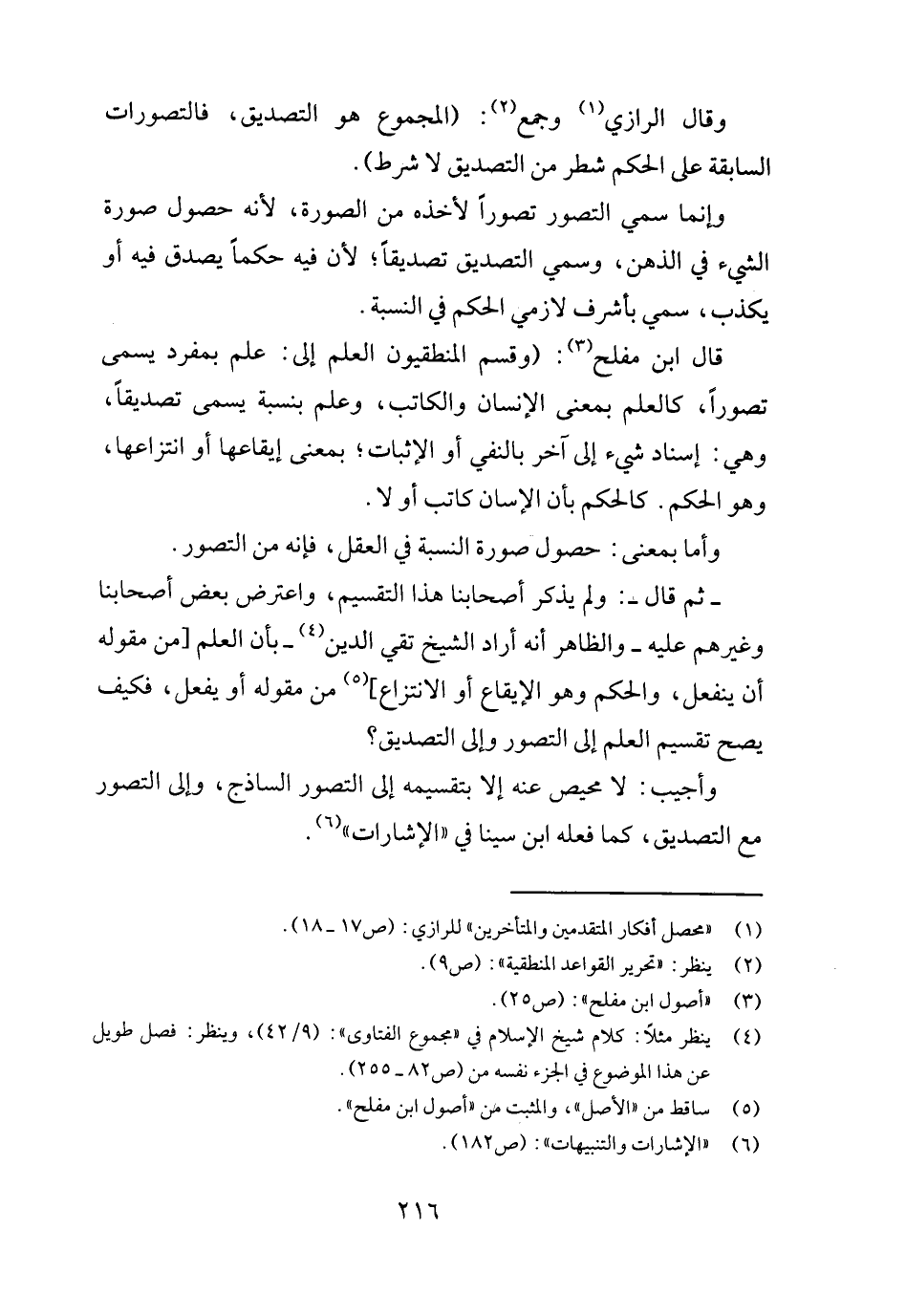 قَالَ ابْن مُفْلِح: (وَقسم المنطقيون الْعلم إِلَى: علم بمفرد يُسمى تصوراً، كَالْعلمِ بِمَعْنى الْإِنْسَان وَالْكَاتِب، وَعلم بِنِسْبَة يُسمى تَصْدِيقًا، وَهِي: إِسْنَاد شَيْء إِلَى آخر بِالنَّفْيِ أَو الْإِثْبَات؛ بِمَعْنى إيقاعها أَو انتزاعها، وَهُوَ الحكم. كَالْحكمِ بِأَن الإسان كَاتب أَو لَا.