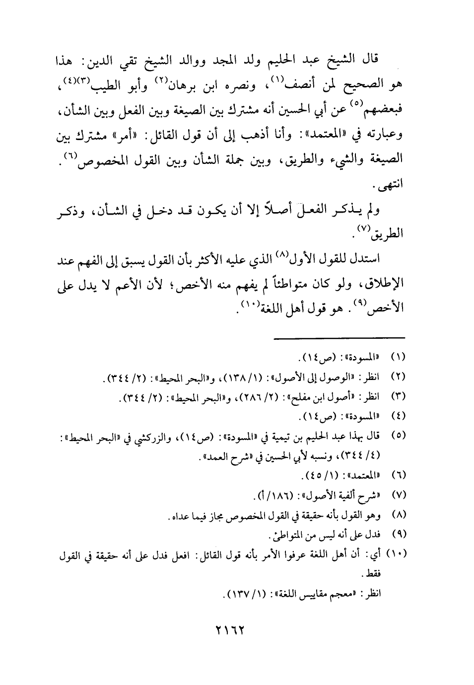 قَالَ الشَّيْخ عبد الْحَلِيم ولد الْمجد ووالد الشَّيْخ تَقِيّ الدّين: هَذَا هُوَ الصَّحِيح لمن أنصف، وَنَصره ابْن برهَان وَأَبُو الطّيب، فبعضهم عَن أبي الْحُسَيْن أَنه مُشْتَرك بَين الصِّيغَة وَبَين الْفِعْل وَبَين الشَّأْن، وَعبارَته فِي " الْمُعْتَمد ": وَأَنا أذهب إِلَى أَن قَول الْقَائِل: " أَمر " مُشْتَرك بَين الصِّيغَة وَالشَّيْء وَالطَّرِيق، وَبَين جملَة الشَّأْن وَبَين القَوْل الْمَخْصُوص. انْتهى.