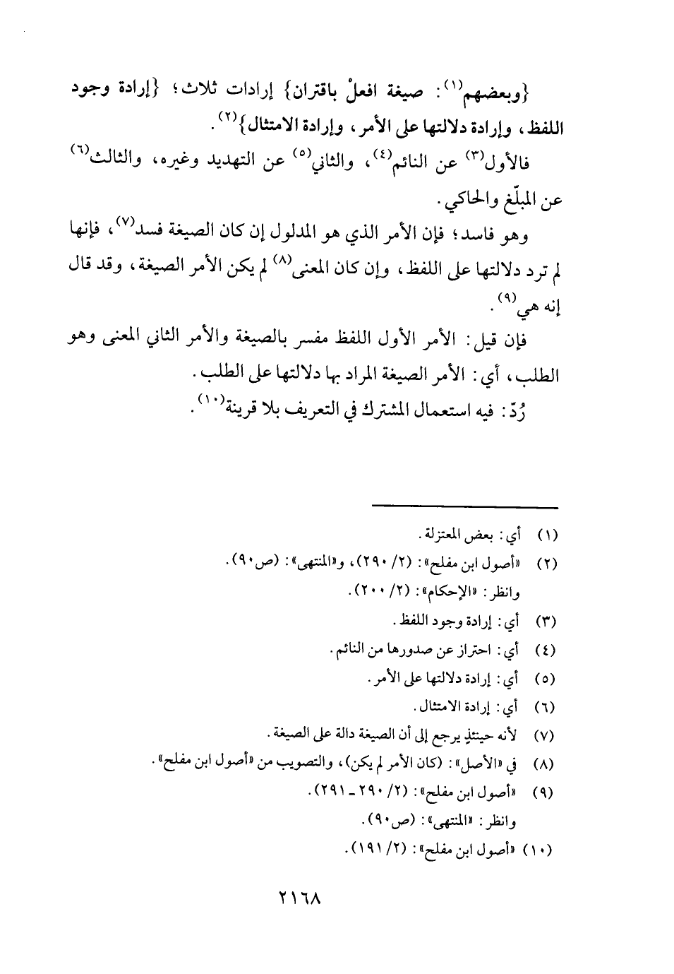 {وَبَعْضهمْ: صِيغَة افْعَل باقتران} إرادات ثَلَاث؛ {إِرَادَة وجود اللَّفْظ، وَإِرَادَة دلالتها على الْأَمر، وَإِرَادَة الِامْتِثَال} .