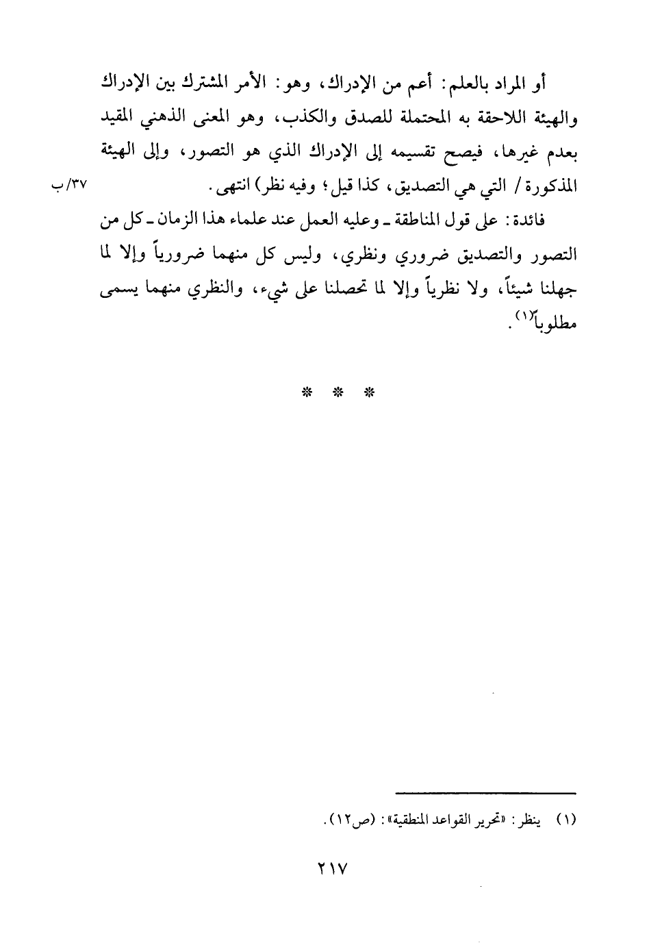 أَو المُرَاد بِالْعلمِ: أَعم من الْإِدْرَاك، وَهُوَ: الْأَمر الْمُشْتَرك بَين الْإِدْرَاك والهيئة اللاحقة بِهِ المحتملة للصدق وَالْكذب، وَهُوَ الْمَعْنى الذهْنِي الْمُقَيد بِعَدَمِ غَيرهَا، فَيصح تقسيمه إِلَى الْإِدْرَاك الَّذِي هُوَ التَّصَوُّر، وَإِلَى الْهَيْئَة الْمَذْكُورَة / الَّتِي هِيَ التَّصْدِيق، كَذَا قيل؛ وَفِيه نظر) انْتهى.