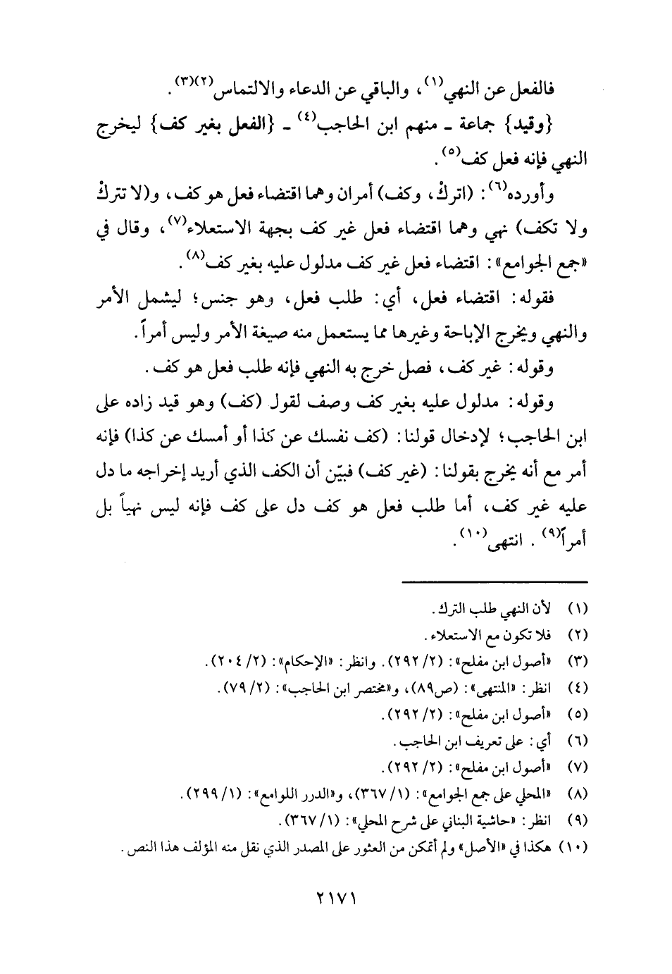 وَقَوله: مَدْلُول عَلَيْهِ بِغَيْر كف وصف لقَوْل (كف) وَهُوَ قيد زَاده على ابْن الْحَاجِب؛ لإدخال قَوْلنَا: (كف نَفسك عَن كَذَا أَو أمسك عَن كَذَا) فَإِنَّهُ أَمر مَعَ أَنه يخرج بقولنَا: (غير كف) فَبين أَن الْكَفّ الَّذِي أُرِيد إِخْرَاجه مَا دلّ عَلَيْهِ غير كف، أما طلب فعل هُوَ كف دلّ على كف فَإِنَّهُ لَيْسَ نهيا بل أمرا. انْتهى.