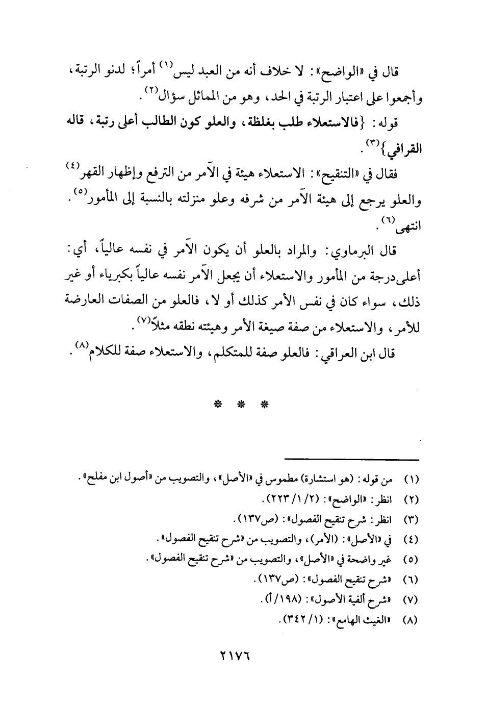فَقَالَ فِي " التَّنْقِيح ": الاستعلاء هَيْئَة فِي الْآمِر من الترفع وَإِظْهَار الْقَهْر والعلو يرجع إِلَى هَيْئَة الْآمِر من شرفه وعلو مَنْزِلَته بِالنِّسْبَةِ إِلَى الْمَأْمُور. انْتهى.