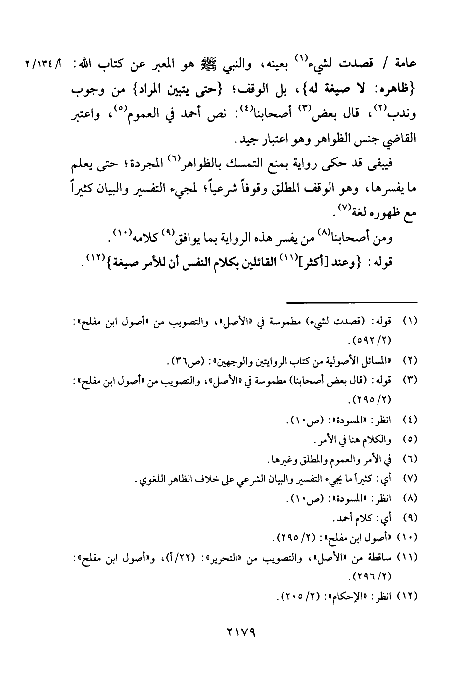 فَيبقى قد حكى رِوَايَة بِمَنْع التَّمَسُّك بالظواهر الْمُجَرَّدَة؛ حَتَّى يعلم مَا يُفَسِّرهَا، وَهُوَ الْوَقْف الْمُطلق وقوفا شَرْعِيًّا؛ لمجيء التَّفْسِير وَالْبَيَان كثيرا مَعَ ظُهُوره لُغَة.
