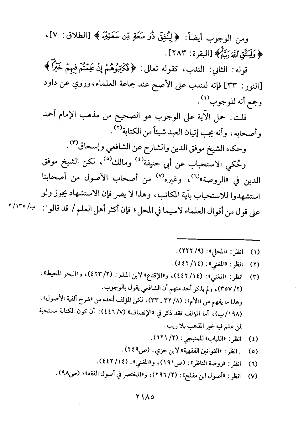 وَحكي الِاسْتِحْبَاب عَن أبي حنيفَة وَمَالك، لَكِن الشَّيْخ موفق الدّين فِي " الرَّوْضَة "، وَغَيره من أَصْحَاب الْأُصُول من أَصْحَابنَا اسْتشْهدُوا للاستحباب بِآيَة الْمكَاتب، وَهَذَا لَا يضر فَإِن الاستشهاد يجوز وَلَو على قَول من أَقْوَال الْعلمَاء لَا سِيمَا فِي الْمحل؛ فَإِن أَكثر أهل الْعلم قد قَالُوا: