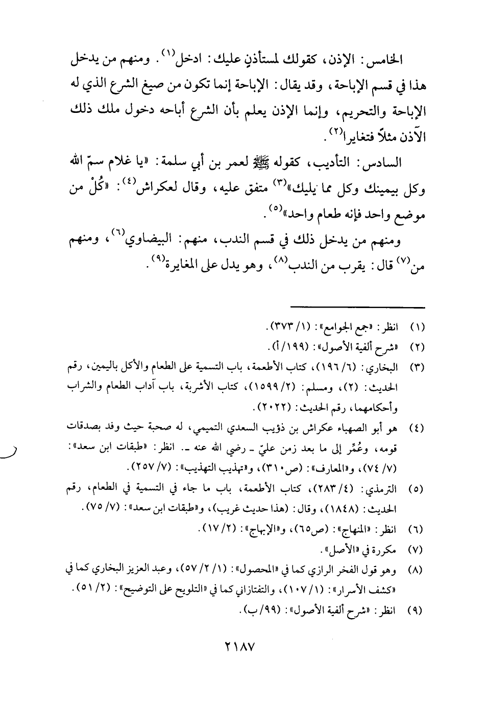 السَّادِس: التَّأْدِيب، كَقَوْلِه - صَلَّى اللَّهُ عَلَيْهِ وَسَلَّم َ - لعمر بن أبي سَلمَة: " يَا غُلَام سم الله وكل بيمينك وكل مِمَّا يليك " مُتَّفق عَلَيْهِ، وَقَالَ لعكراش: " كل من مَوضِع وَاحِد فَإِنَّهُ طَعَام وَاحِد ".