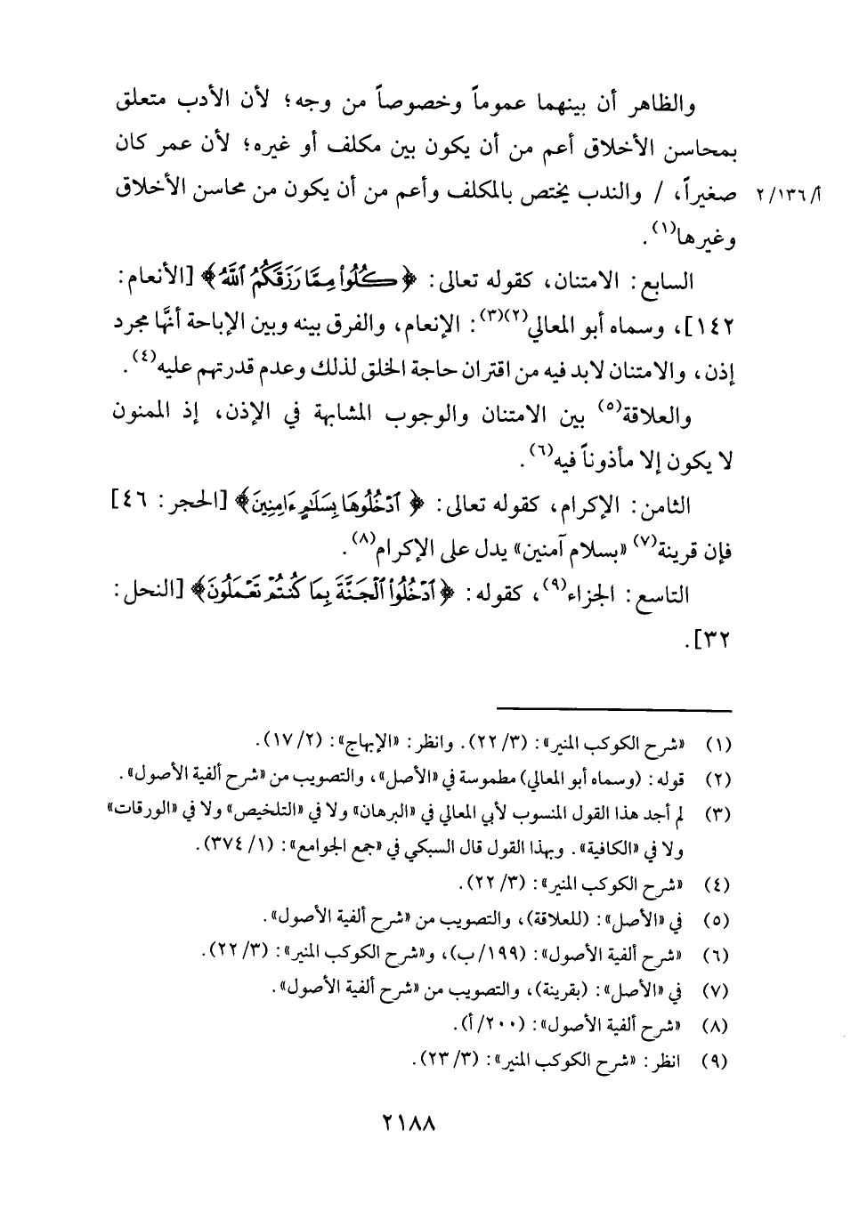 السَّابِع: الامتنان، كَقَوْلِه تَعَالَى: {كلوا مِمَّا رزقكم الله} [الْأَنْعَام: ١٤٢] ، وَسَماهُ أَبُو الْمَعَالِي: الإنعام، وَالْفرق بَينه وَبَين الْإِبَاحَة أَنَّهَا مُجَرّد إِذن، والامتنان لَا بُد فِيهِ من اقتران حَاجَة الْخلق لذَلِك وَعدم قدرتهم عَلَيْهِ.