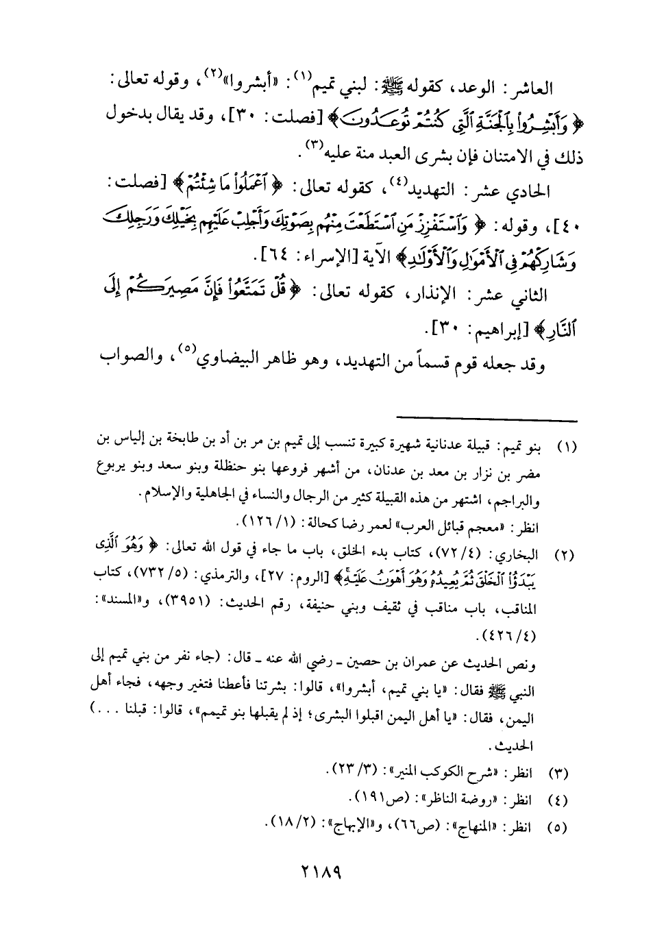 الْعَاشِر: الْوَعْد، كَقَوْلِه - صَلَّى اللَّهُ عَلَيْهِ وَسَلَّم َ -: لبني تَمِيم: " أَبْشِرُوا "، وَقَوله تَعَالَى: {وَأَبْشِرُوا بِالْجنَّةِ الَّتِي كُنْتُم توعدون} [فصلت: ٣٠] ، وَقد يُقَال بِدُخُول ذَلِك فِي الامتنان فَإِن بشرى العَبْد منَّة عَلَيْهِ.