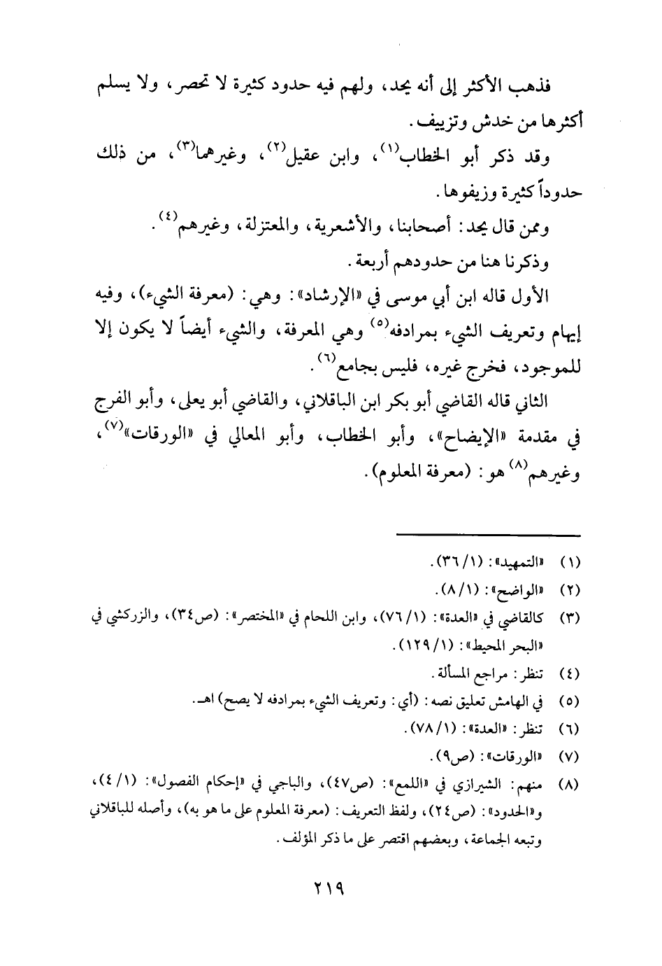 وَقد ذكر أَبُو الْخطاب، وَابْن عقيل، وَغَيرهمَا، من ذَلِك حدوداً كَثِيرَة وزيفوها.