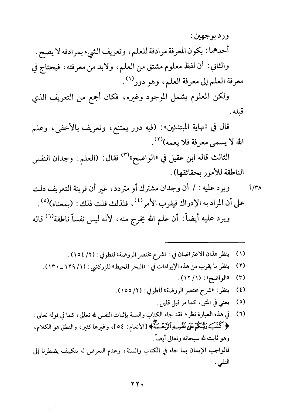 قَالَ فِي " نِهَايَة المبتدئين ": (فِيهِ دور يمْتَنع، وتعريف بالأخفى، وَعلم الله لَا يُسمى معرفَة فَلَا يعمه) .