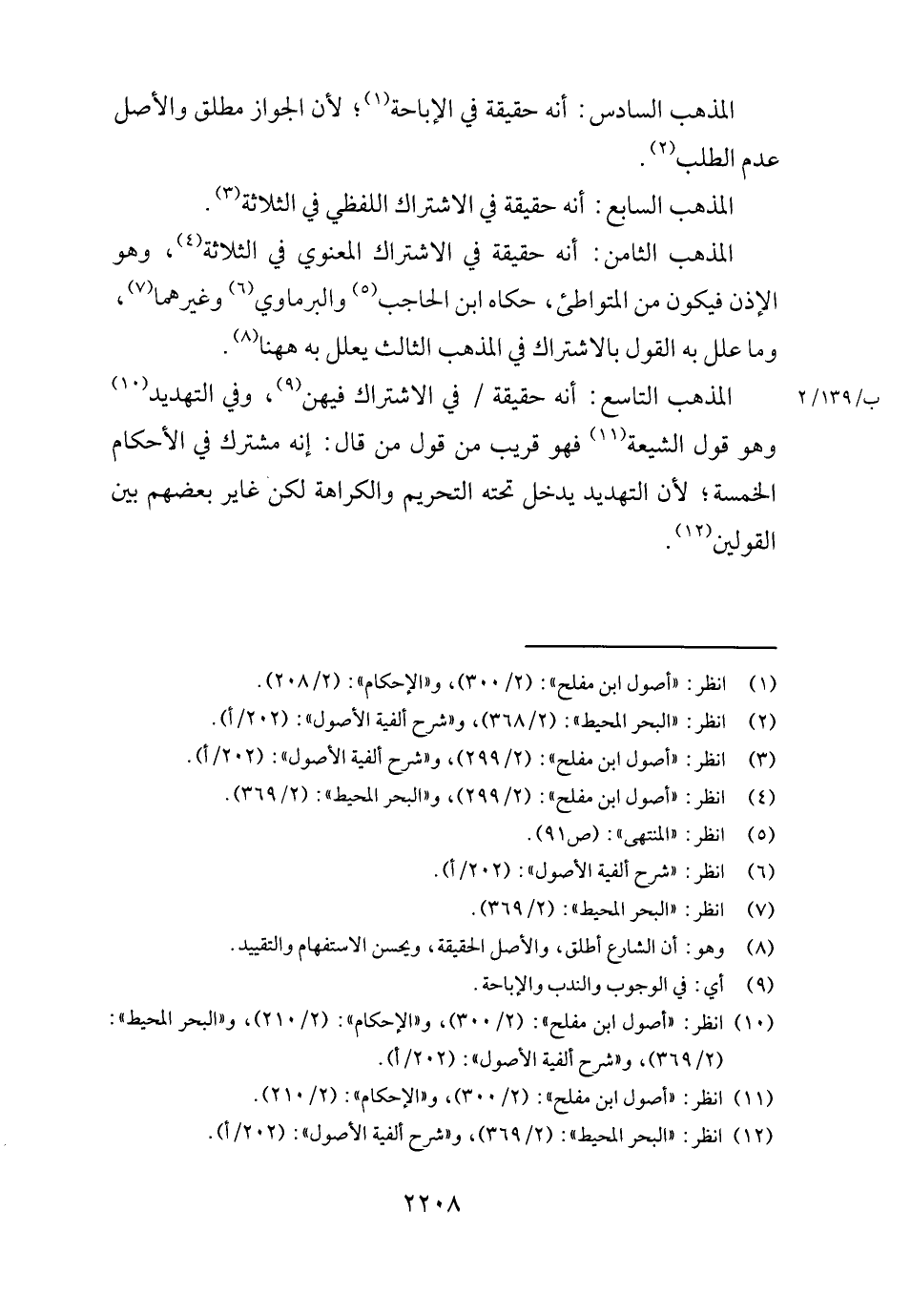 الْمَذْهَب التَّاسِع: أَنه حَقِيقَة فِي الِاشْتِرَاك فِيهِنَّ، وَفِي التهديد وَهُوَ قَول الشِّيعَة فَهُوَ قريب من قَول من قَالَ: إِنَّه مُشْتَرك فِي الْأَحْكَام الْخَمْسَة؛ لِأَن التهديد يدْخل تَحْتَهُ التَّحْرِيم وَالْكَرَاهَة لَكِن غاير بَعضهم بَين الْقَوْلَيْنِ.