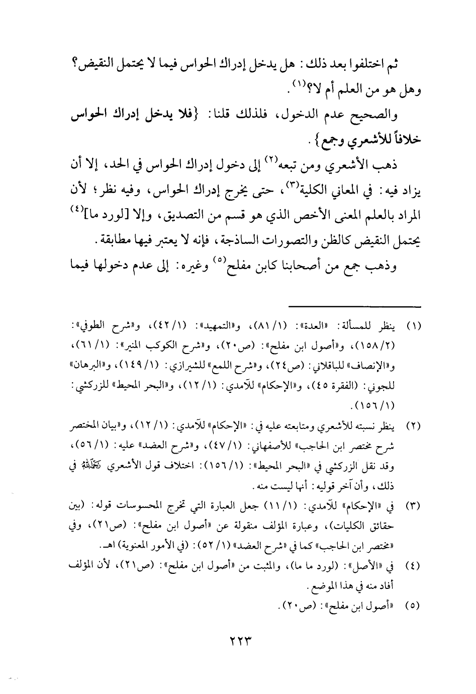 ذهب الْأَشْعَرِيّ وَمن تبعه إِلَى دُخُول إِدْرَاك الْحَواس فِي الْحَد، إِلَّا أَن يُزَاد فِيهِ: فِي الْمعَانِي الْكُلية، حَتَّى يخرج إِدْرَاك الْحَواس، وَفِيه نظر؛ لِأَن المُرَاد بِالْعلمِ الْمَعْنى الْأَخَص الَّذِي هُوَ قسم من التَّصْدِيق، وَإِلَّا [لورد مَا] يحْتَمل النقيض كالظن والتصورات الساذجة، فَإِنَّهُ لَا يعْتَبر فِيهَا مُطَابقَة.