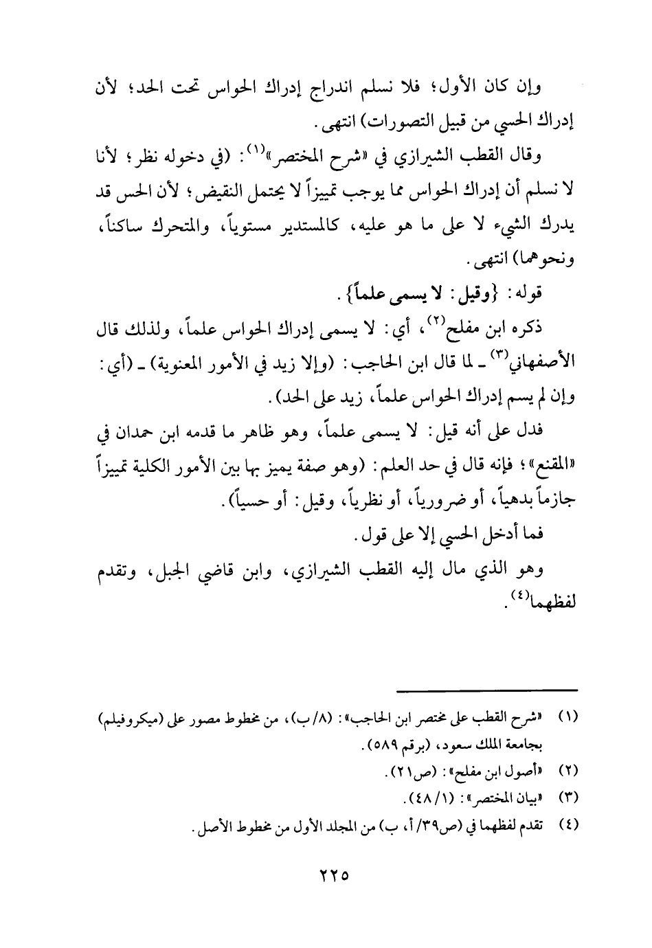 ذكره ابْن مُفْلِح، أَي: لَا يُسمى إِدْرَاك الْحَواس علما، وَلذَلِك قَالَ الْأَصْفَهَانِي - لما قَالَ ابْن الْحَاجِب: (وَإِلَّا زيد فِي الْأُمُور المعنوية) - (أَي: وَإِن لم يسم إِدْرَاك الْحَواس علما، زيد على الْحَد) .
