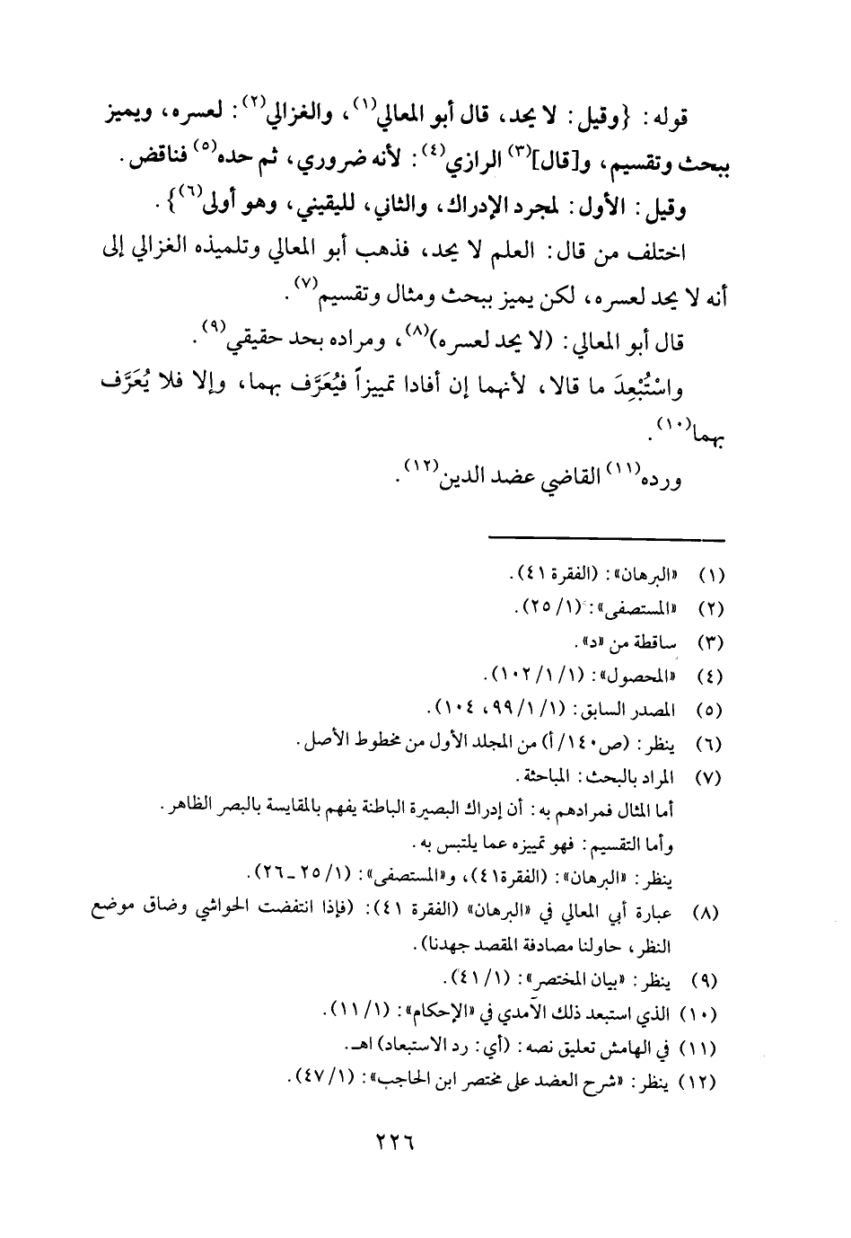 اخْتلف من قَالَ: الْعلم لَا يحد، فَذهب أَبُو الْمَعَالِي وتلميذه الْغَزالِيّ إِلَى أَنه لَا يحد لعسره، لَكِن يُمَيّز ببحث وَمِثَال وتقسيم.