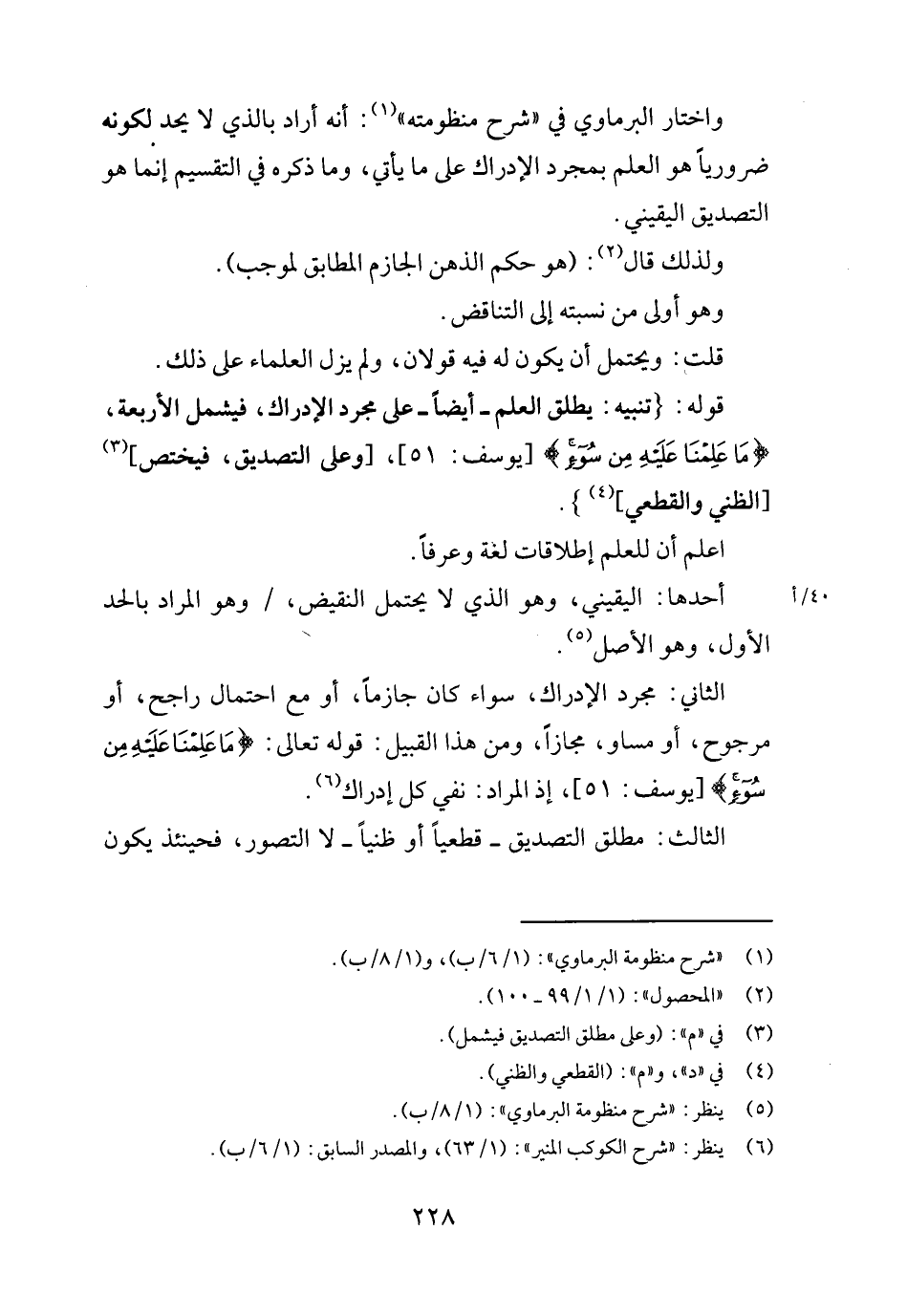 وَاخْتَارَ الْبرمَاوِيّ فِي " شرح منظومته ": أَنه أَرَادَ بِالَّذِي لَا يحد لكَونه ضَرُورِيًّا هُوَ الْعلم بِمُجَرَّد الْإِدْرَاك على مَا يَأْتِي، وَمَا ذكره فِي التَّقْسِيم إِنَّمَا هُوَ التَّصْدِيق اليقيني.