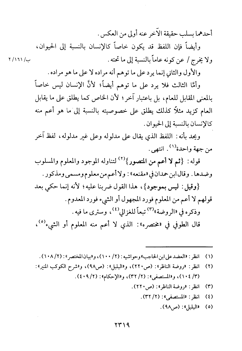 {وَقيل: لَيْسَ بموجود} ، هَذَا القَوْل ضربنا عَلَيْهِ؛ لِأَنَّهُ إِنَّمَا حُكيَ بعد قَوْلهم لَا أَعم من الْمَعْلُوم فورد الْمَجْهُول أَو الشَّيْء فورد الْمَعْدُوم.