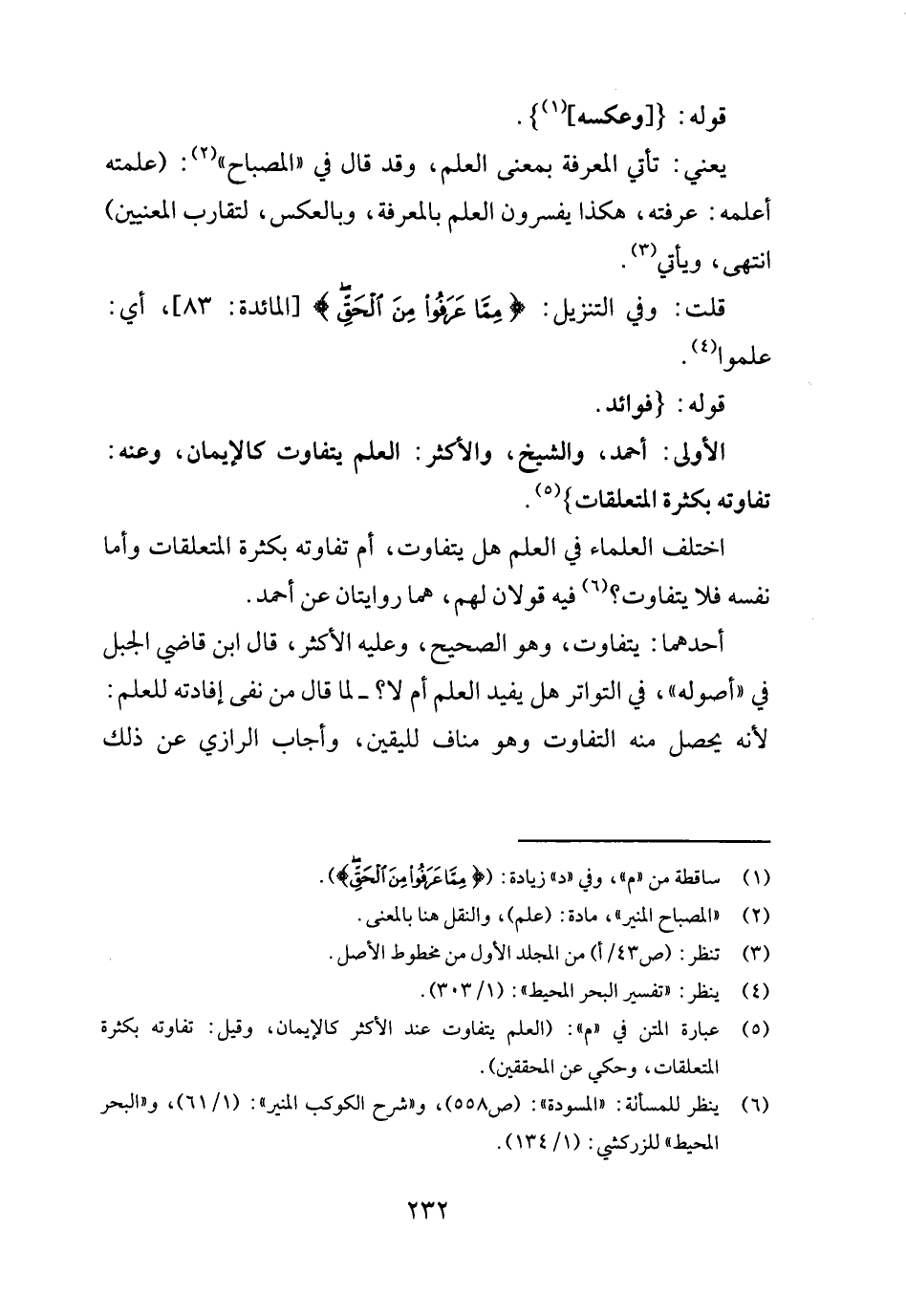 قَوْله: {فَوَائِد. الأولى: أَحْمد، وَالشَّيْخ، وَالْأَكْثَر: الْعلم يتَفَاوَت كالإيمان، وَعنهُ: تفاوته بِكَثْرَة المتعلقات} .