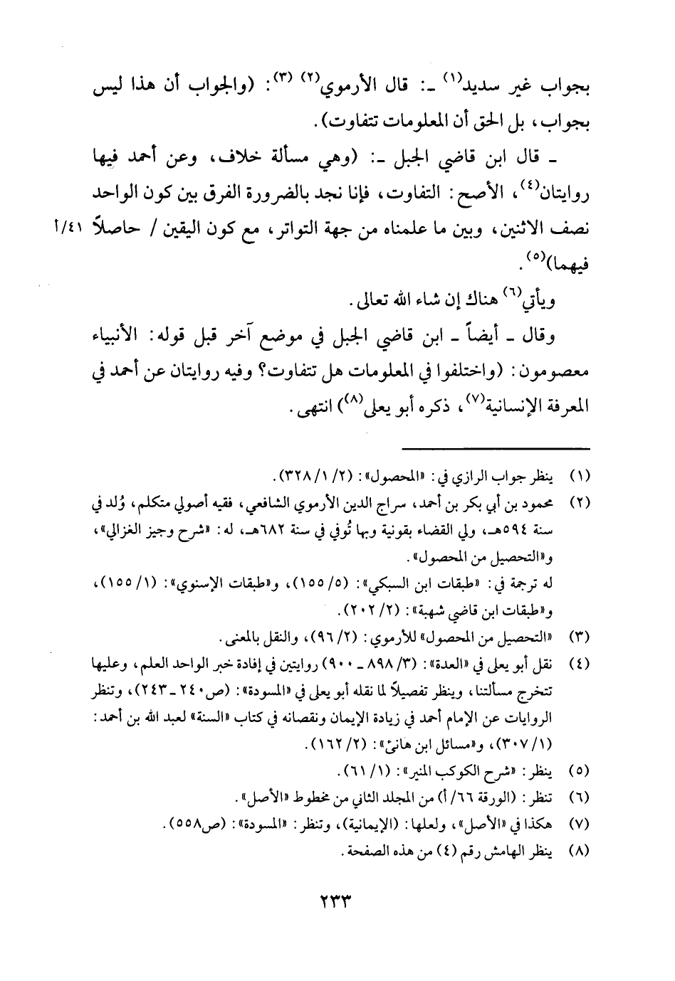 بِجَوَاب غير سديد -: قَالَ الأرموي: (وَالْجَوَاب أَن هَذَا لَيْسَ بِجَوَاب، بل الْحق أَن المعلومات تَتَفَاوَت) . - قَالَ ابْن قَاضِي الْجَبَل -: (وَهِي مَسْأَلَة خلاف، وَعَن أَحْمد فِيهَا رِوَايَتَانِ، الْأَصَح: التَّفَاوُت، فَإنَّا نجد بِالضَّرُورَةِ الْفرق بَين كَون الْوَاحِد نصف الِاثْنَيْنِ، وَبَين مَا علمناه من جِهَة التَّوَاتُر، مَعَ كَون الْيَقِين / حَاصِلا فيهمَا) .