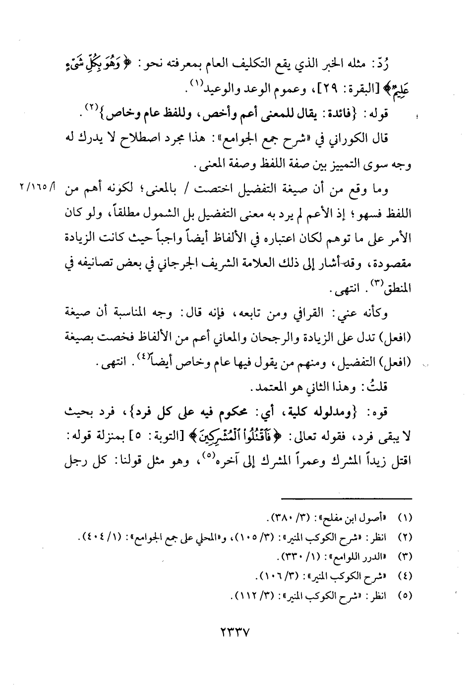 قوه: {ومدلوله كُلية، أَي: مَحْكُوم فِيهِ على كل فَرد} ، فَرد بِحَيْثُ لَا يبْقى فَرد، فَقَوله تَعَالَى: {فَاقْتُلُوا الْمُشْركين} [التَّوْبَة: ٥] بِمَنْزِلَة قَوْله: اقْتُل زيدا الْمُشرك وعمرا الْمُشرك إِلَى آخِره، وَهُوَ مثل قَوْلنَا: كل رجل
