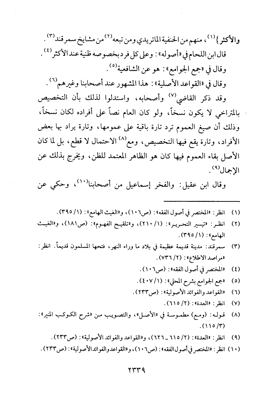 وَقد ذكر القَاضِي وَأَصْحَابه، وَاسْتَدَلُّوا لذَلِك بِأَن التَّخْصِيص بالمتراخي لَا يكون نسخا، وَلَو كَانَ الْعَام نصا على أَفْرَاده لَكَانَ نسخا، وَذَلِكَ أَن صِيغ الْعُمُوم ترد تَارَة بَاقِيَة على عمومها، وَتارَة يُرَاد بهَا بعض الْأَفْرَاد، وَتارَة يَقع فِيهَا التَّخْصِيص، وَمَعَ الِاحْتِمَال لَا قطع، بل لما كَانَ الأَصْل بَقَاء الْعُمُوم فِيهَا كَانَ هُوَ الظَّاهِر الْمُعْتَمد للظن، وَيخرج بذلك عَن الْإِجْمَال.