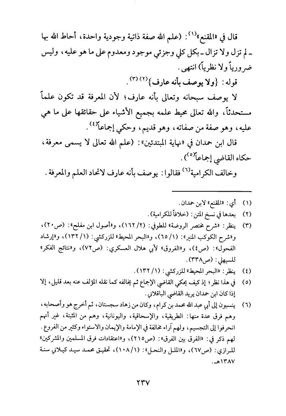 قَالَ فِي الْمقنع: (علم الله صفة ذاتية وجودية وَاحِدَة، أحَاط الله بهَا - لم تزل وَلَا تزَال - بِكُل كلي وجزئي مَوْجُود ومعدوم على مَا هُوَ عَلَيْهِ، وَلَيْسَ ضَرُورِيًّا وَلَا نظرياً) انْتهى.