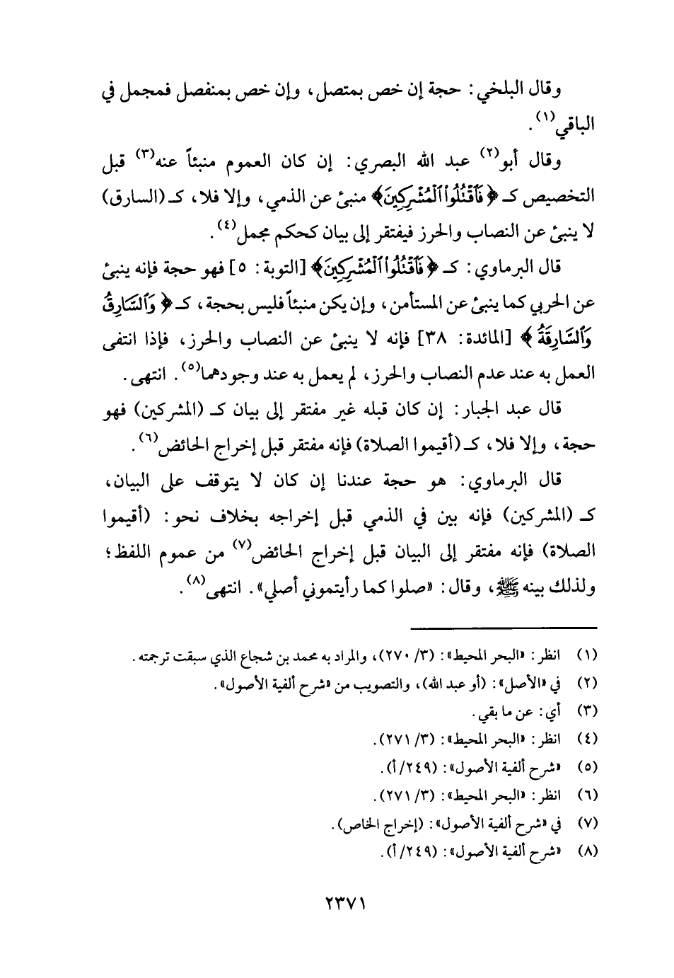 وَقَالَ أَبُو عبد الله الْبَصْرِيّ: إِن كَانَ الْعُمُوم منبئا عَنهُ قبل التَّخْصِيص ك {فَاقْتُلُوا الْمُشْركين} منبئ عَن الذِّمِّيّ، وَإِلَّا فَلَا، ك (السَّارِق) لَا يُنبئ عَن النّصاب والحرز فيفتقر إِلَى بَيَان كَحكم مُجمل.