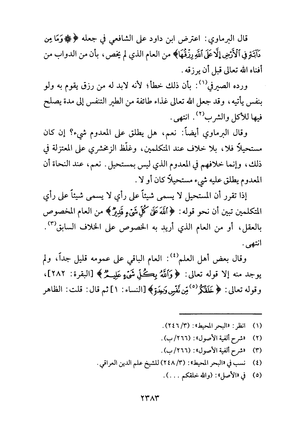 وَقَالَ الْبرمَاوِيّ أَيْضا: نعم، هَل يُطلق على الْمَعْدُوم شَيْء؟ إِن كَانَ مستحيلا فَلَا، بِلَا خلاف عِنْد الْمُتَكَلِّمين، وَغلظ الزَّمَخْشَرِيّ على الْمُعْتَزلَة فِي ذَلِك، وَإِنَّمَا خلافهم فِي الْمَعْدُوم الَّذِي لَيْسَ بمستحيل. نعم، عِنْد النُّحَاة أَن الْمَعْدُوم يُطلق عَلَيْهِ شَيْء مستحيلا كَانَ أَو لَا.