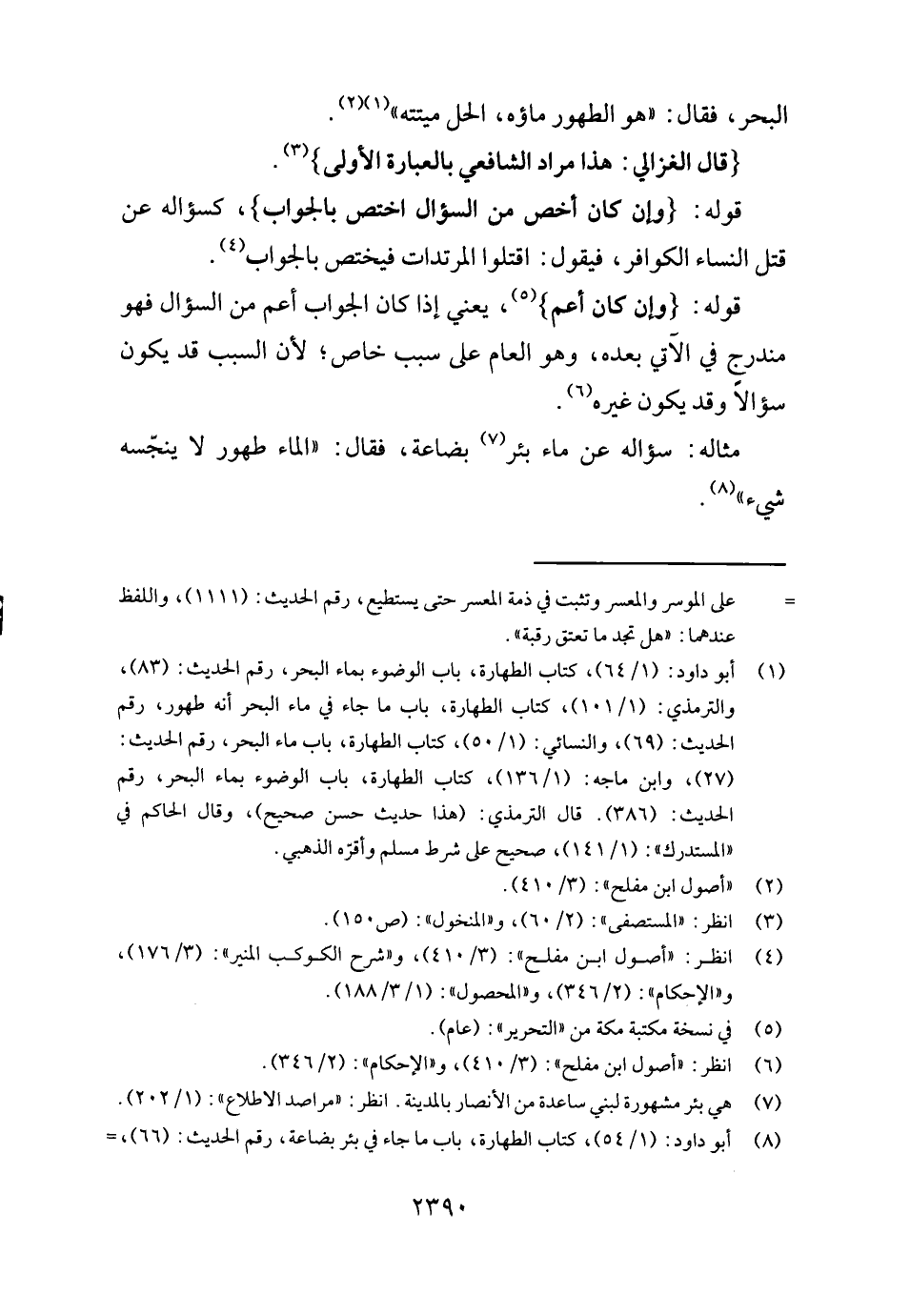 مِثَاله: سُؤَاله عَن مَاء بِئْر بضَاعَة، فَقَالَ: " المَاء طهُور لَا يُنجسهُ شَيْء ".