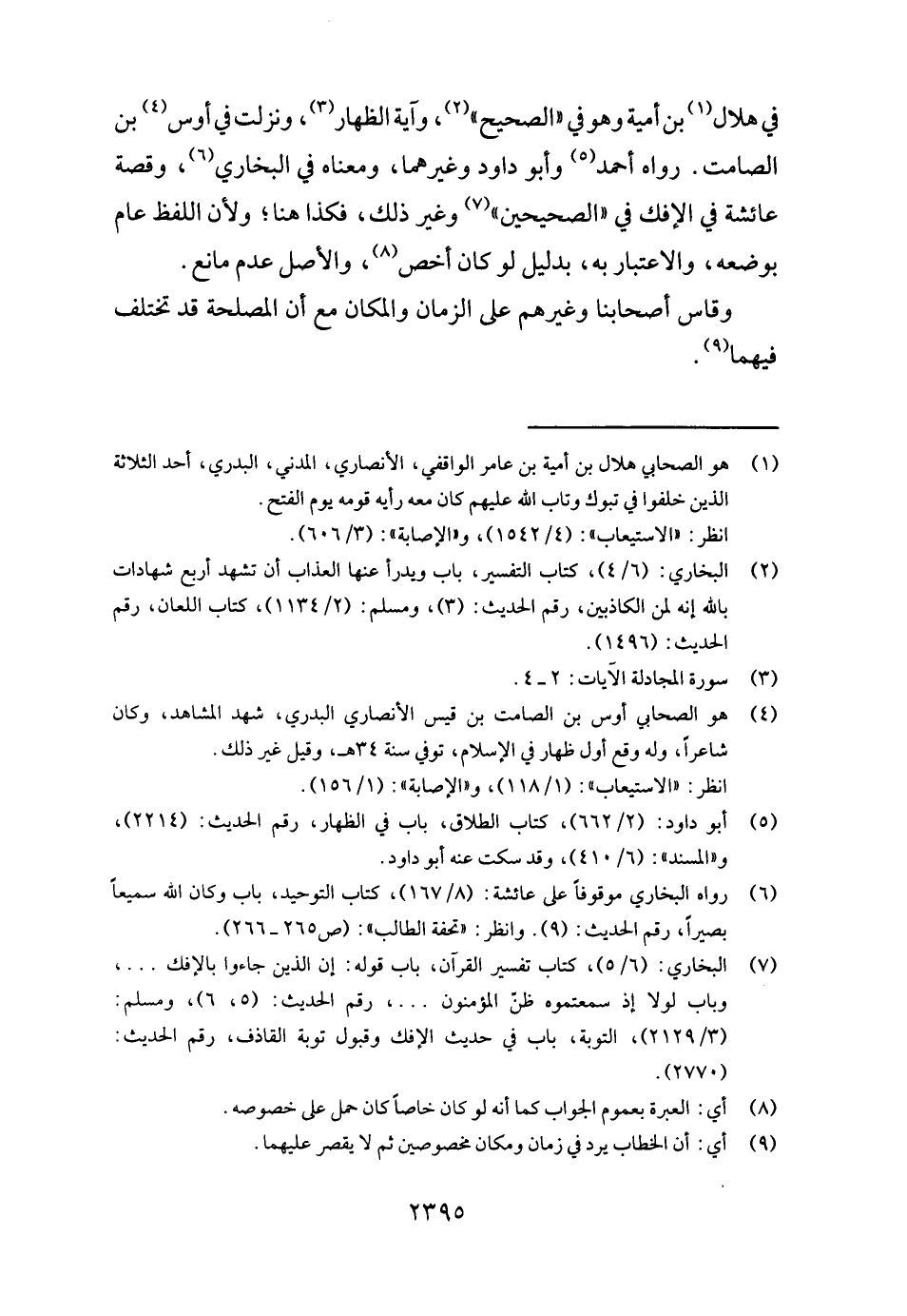 فِي هِلَال بن أُميَّة وَهُوَ فِي " الصَّحِيح "، وَآيَة الظِّهَار، وَنزلت فِي أَوْس بن الصَّامِت. رَوَاهُ أَحْمد وَأَبُو دَاوُد وَغَيرهمَا، وَمَعْنَاهُ فِي البُخَارِيّ، وقصة عَائِشَة فِي الْإِفْك فِي " الصَّحِيحَيْنِ " وَغير ذَلِك، فَكَذَا هُنَا؛ وَلِأَن اللَّفْظ عَام بِوَضْعِهِ، وَالِاعْتِبَار بِهِ، بِدَلِيل لَو كَانَ أخص، وَالْأَصْل عدم مَانع.