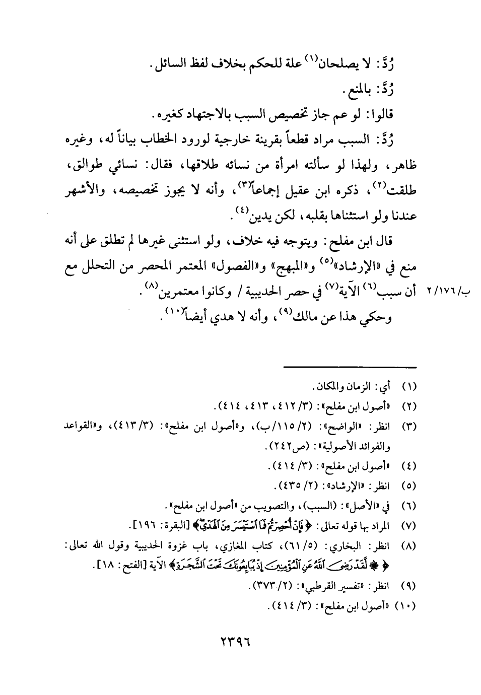 رد: السَّبَب مُرَاد قطعا بِقَرِينَة خارجية لوُرُود الْخطاب بَيَانا لَهُ، وَغَيره ظَاهر، وَلِهَذَا لَو سَأَلته امْرَأَة من نِسَائِهِ طَلاقهَا، فَقَالَ: نسَائِي طَوَالِق، طلقت، ذكره ابْن عقيل إِجْمَاعًا، وَأَنه لَا يجوز تَخْصِيصه، وَالْأَشْهر عندنَا وَلَو استثناها بِقَلْبِه، لَكِن يدين.