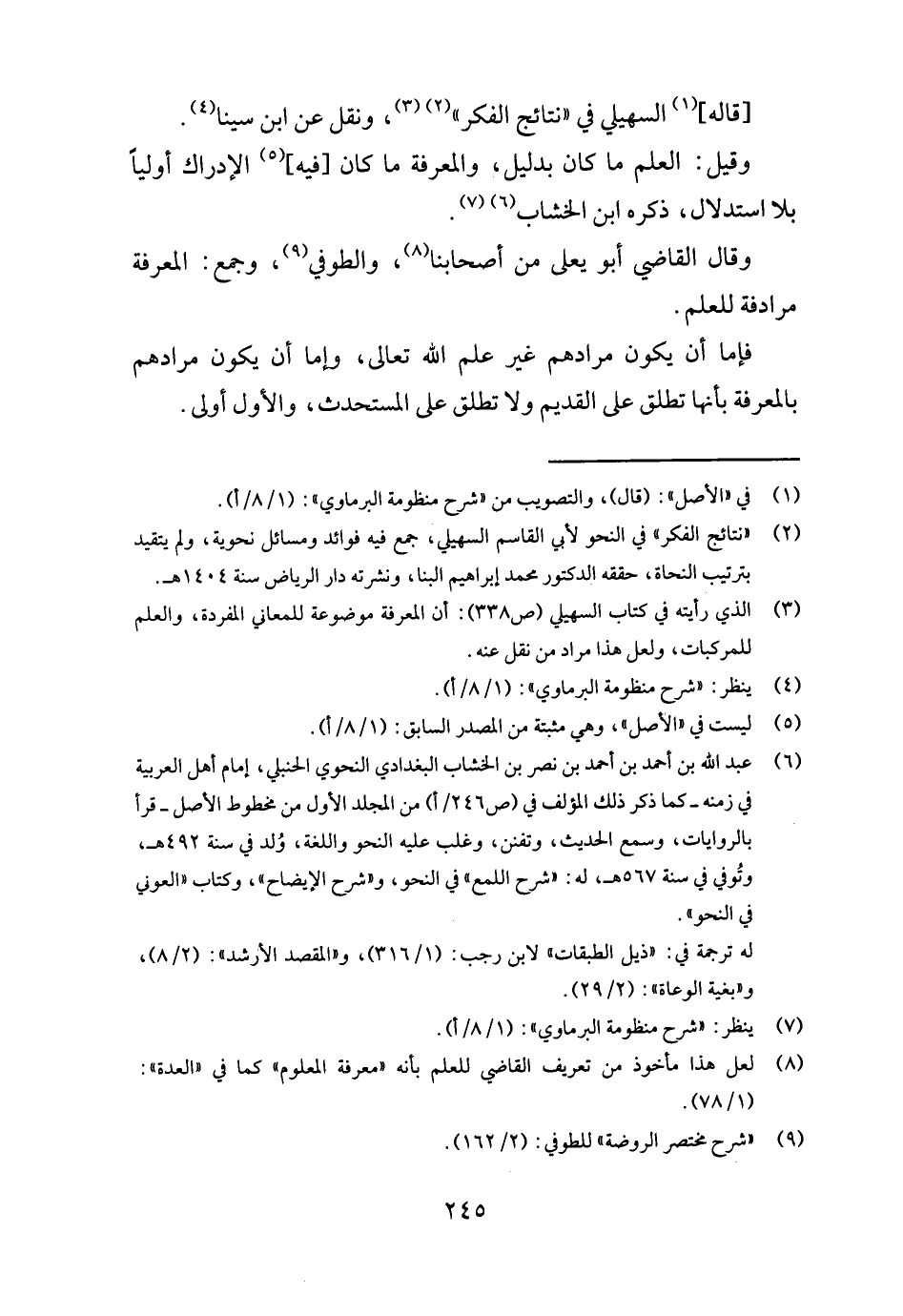 وَقَالَ القَاضِي أَبُو يعلى من أَصْحَابنَا، والطوفي، وَجمع: الْمعرفَة مرادفة للْعلم.
