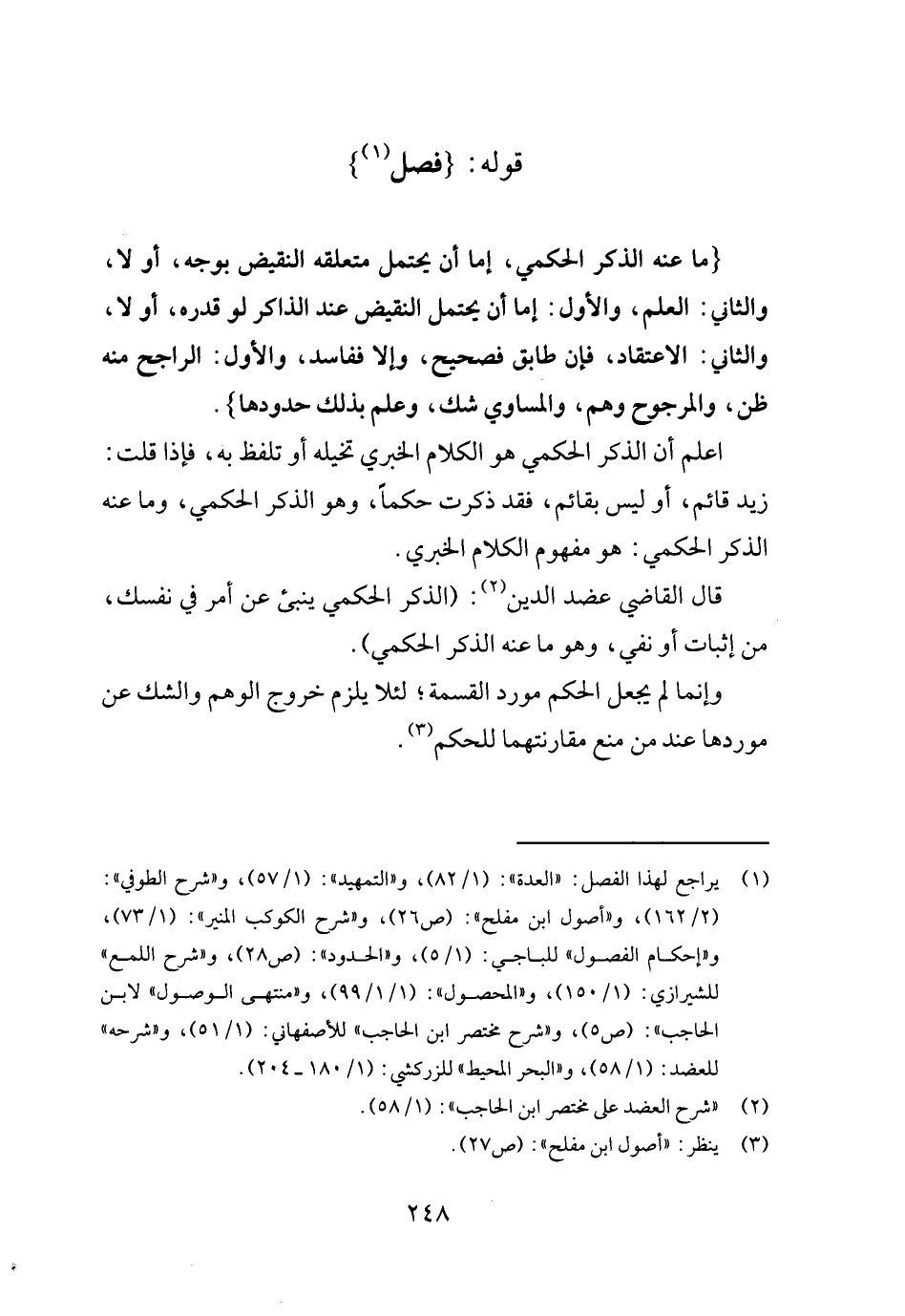 {مَا عَنهُ الذّكر الْحكمِي، إِمَّا أَن يحْتَمل مُتَعَلّقه النقيض بِوَجْه، أَو لَا، وَالثَّانِي: الْعلم، وَالْأول: إِمَّا أَن يحْتَمل النقيض عِنْد الذاكر لَو قدره، أَولا، وَالثَّانِي: الِاعْتِقَاد، فَإِن طابق فَصَحِيح، وَإِلَّا ففاسد، وَالْأول: الرَّاجِح مِنْهُ ظن، والمرجوح وهم، والمساوي شكّ، وَعلم بذلك حُدُودهَا} .