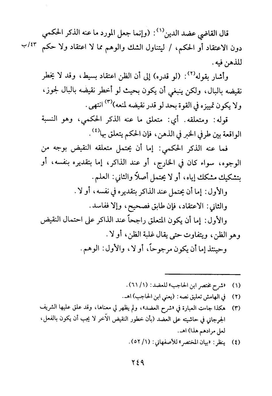 فَمَا عَنهُ الذّكر الْحكمِي: إِمَّا أَن يحْتَمل مُتَعَلّقه النقيض بِوَجْه من الْوُجُوه، سَوَاء كَانَ فِي الْخَارِج، أَو عِنْد الذاكر، إِمَّا بتقديره بِنَفسِهِ، أَو بتشكيك مشكك إِيَّاه، أَو لَا يحْتَمل أصلا وَالثَّانِي: الْعلم.