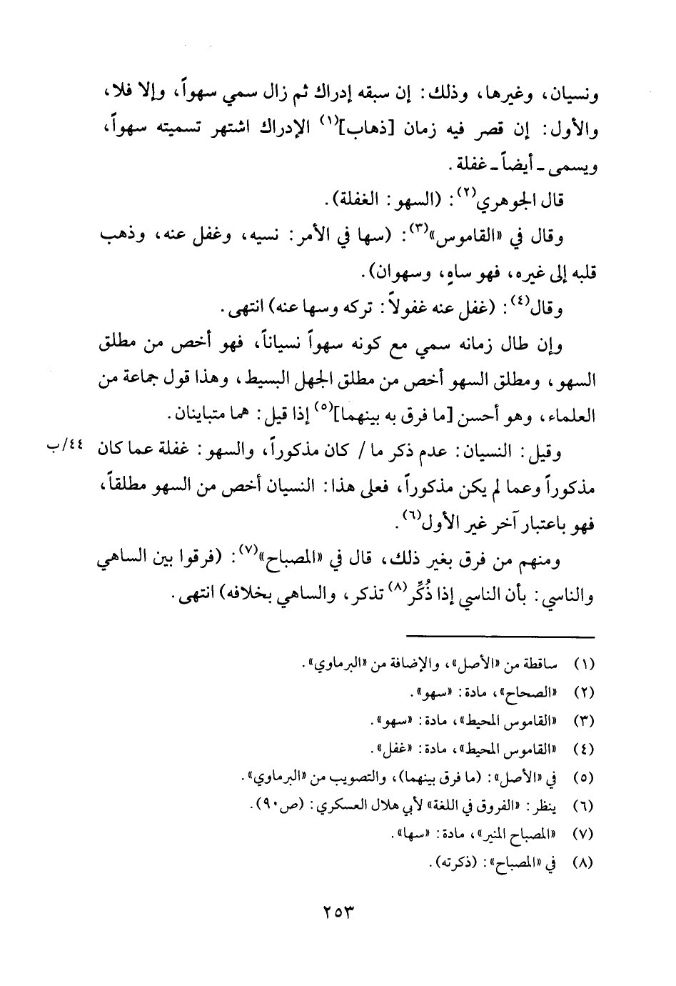 وَقَالَ فِي " الْقَامُوس ": (سَهَا فِي الْأَمر: نَسيَه، وغفل عَنهُ، وَذهب قلبه إِلَى غَيره، فَهُوَ ساه، وسهوان) .