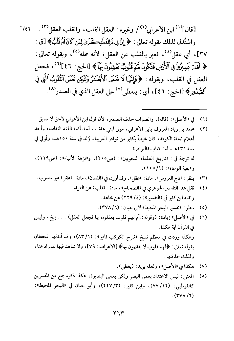 [قَالَ] ابْن الْأَعرَابِي / وَغَيره: الْعقل الْقلب، وَالْقلب الْعقل ,