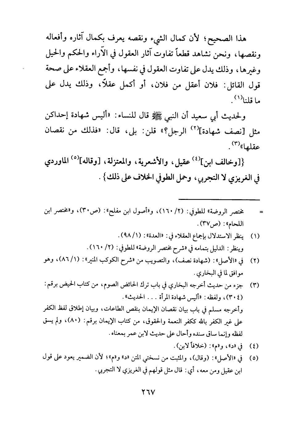 وَلِحَدِيث أبي سعيد أَن النَّبِي - صَلَّى اللَّهُ عَلَيْهِ وَسَلَّم َ - قَالَ للنِّسَاء: " أَلَيْسَ شَهَادَة إحداكن مثل [نصف شَهَادَة] الرجل؟ " قُلْنَ: بلَى، قَالَ: " فَذَلِك من نُقْصَان عقلهَا ". { [وَخَالف ابْن] عقيل، والأشعرية، والمعتزلة، [وَقَالَهُ] الْمَاوَرْدِيّ فِي الغريزي لَا التجربي، وَحمل الطوفي الْخلاف على ذَلِك} .