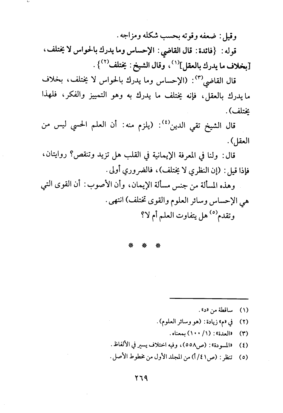 وَهَذِه الْمَسْأَلَة من جنس مَسْأَلَة الْإِيمَان، وَأَن الأصوب: أَن القوى الَّتِي هِيَ الإحساس وَسَائِر الْعُلُوم والقوى تخْتَلف) انْتهى.