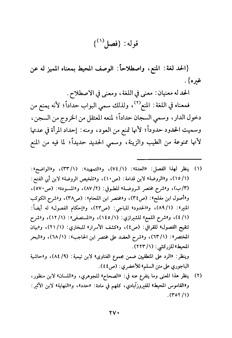 {الْحَد لُغَة: الْمَنْع، وَاصْطِلَاحا: الْوَصْف الْمُحِيط بِمَعْنَاهُ الْمُمَيز لَهُ عَن غَيره} .