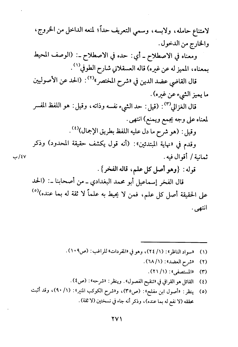 قَالَ الْفَخر إِسْمَاعِيل أَبُو مُحَمَّد الْبَغْدَادِيّ - من أَصْحَابنَا -: (الْحَد على الْحَقِيقَة أصل كل علم، فَمن لَا يُحِيط بِهِ علما لَا ثِقَة لَهُ بِمَا عِنْده) . انْتهى.