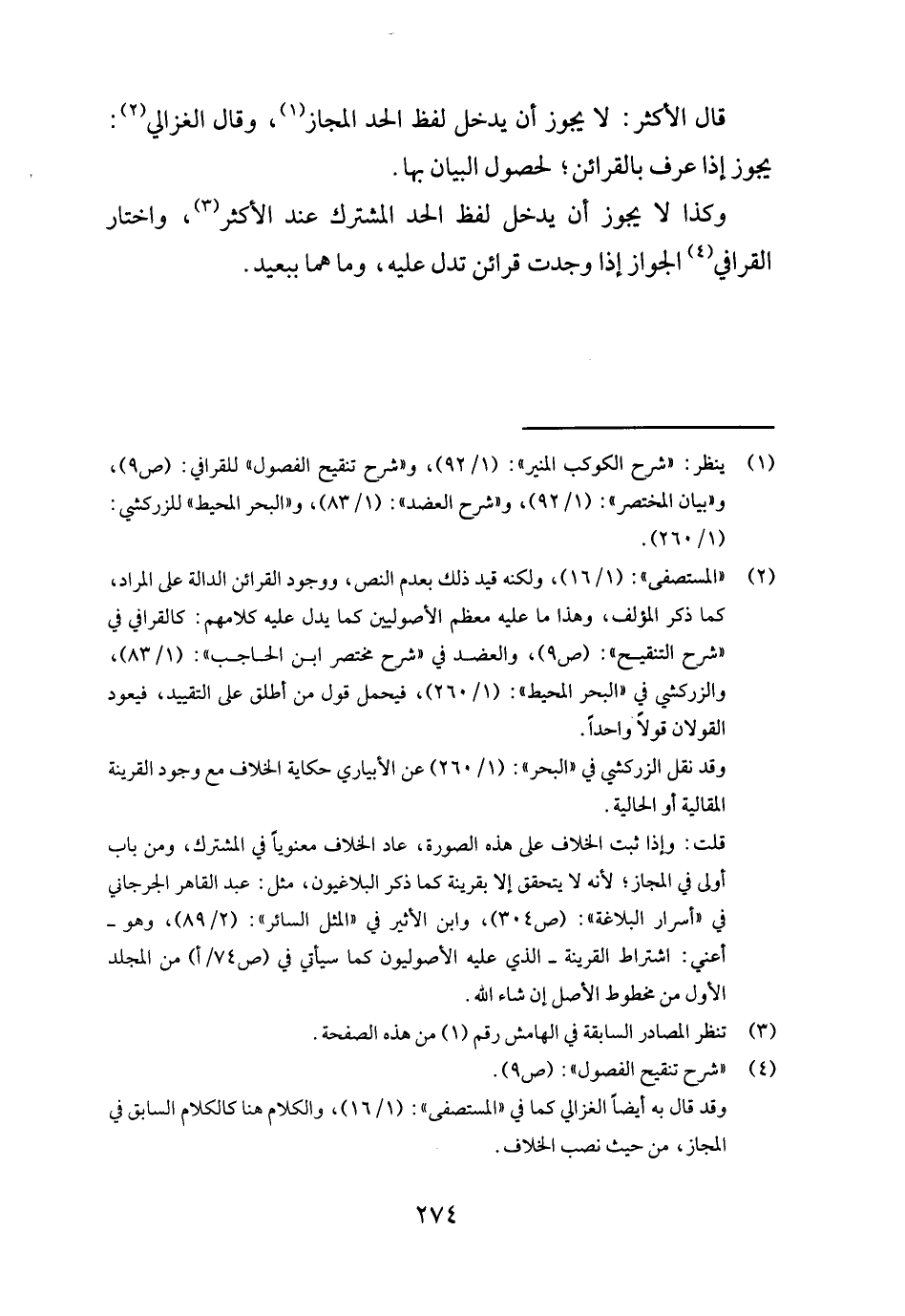 قَالَ الْأَكْثَر: لَا يجوز أَن يدْخل لفظ الْحَد الْمجَاز، وَقَالَ الْغَزالِيّ: يجوز إِذا عرف بالقرائن؛ لحُصُول الْبَيَان بهَا.