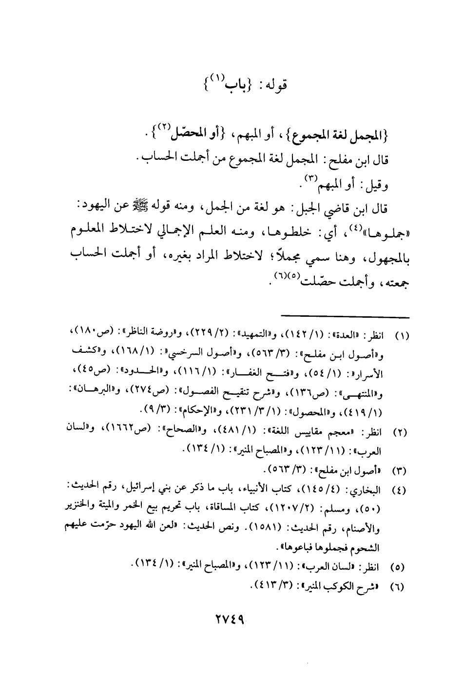 قَالَ ابْن مُفْلِح: الْمُجْمل لُغَة الْمَجْمُوع من أجملت الْحساب.