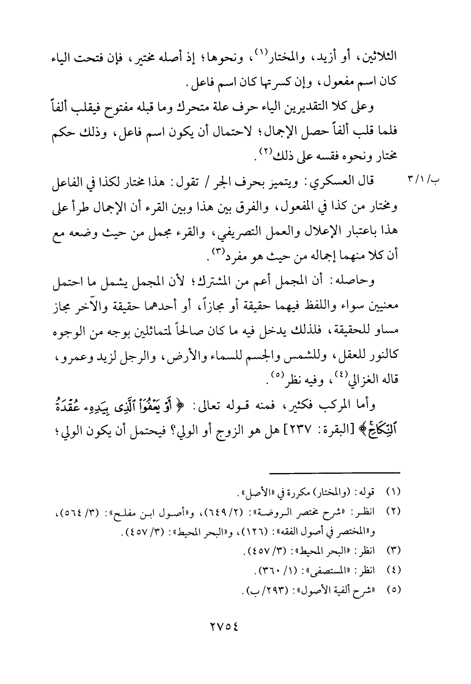 وَأما الْمركب فكثير، فَمِنْهُ قَوْله تَعَالَى: {أَو يعفوا الَّذِي بِيَدِهِ عقدَة النِّكَاح} [الْبَقَرَة: ٢٣٧] هَل هُوَ الزَّوْج أَو الْوَلِيّ؟ فَيحْتَمل أَن يكون الْوَلِيّ؛