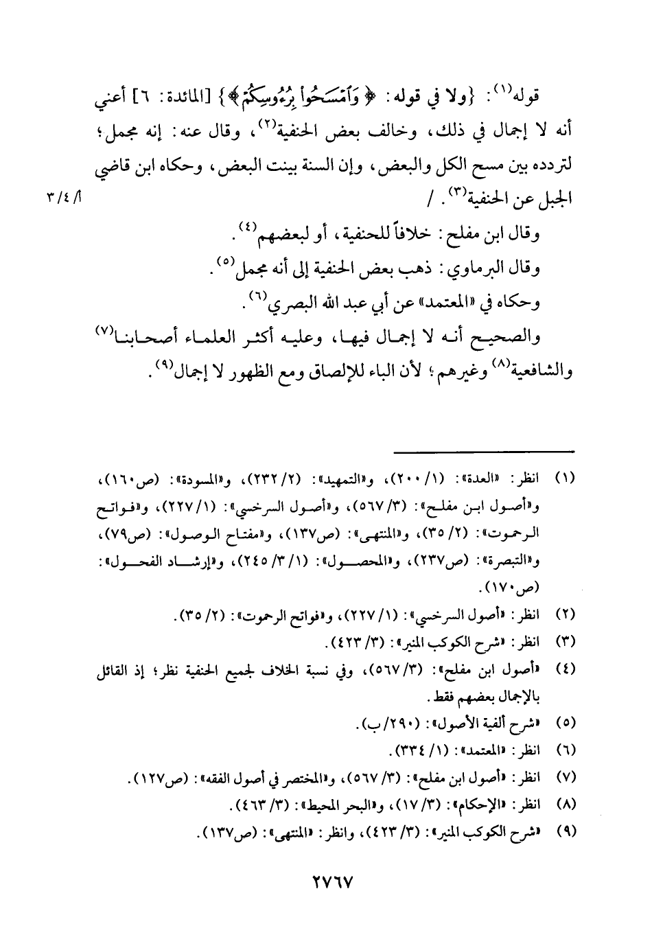 قَوْله: {وَلَا فِي قَوْله: {وامسحوا برءوسكم} [الْمَائِدَة: ٦] أَعنِي أَنه لَا إِجْمَال فِي ذَلِك، وَخَالف بعض الْحَنَفِيَّة، وَقَالَ عَنهُ: إِنَّه مُجمل؛ لتردده بَين مسح الْكل وَالْبَعْض، وَإِن السّنة بيّنت الْبَعْض، وَحَكَاهُ ابْن قَاضِي الْجَبَل عَن الْحَنَفِيَّة.