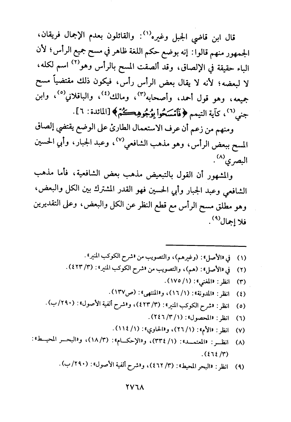 وَالْمَشْهُور أَن القَوْل بالتبعيض مَذْهَب بعض الشَّافِعِيَّة، فَأَما مَذْهَب الشَّافِعِي وَعبد الْجَبَّار وَأبي الْحُسَيْن فَهُوَ الْقدر الْمُشْتَرك بَين الْكل وَالْبَعْض، وَهُوَ مُطلق مسح الرَّأْس مَعَ قطع النّظر عَن الْكل وَالْبَعْض، وعَلى التَّقْدِيرَيْنِ فَلَا إِجْمَال.