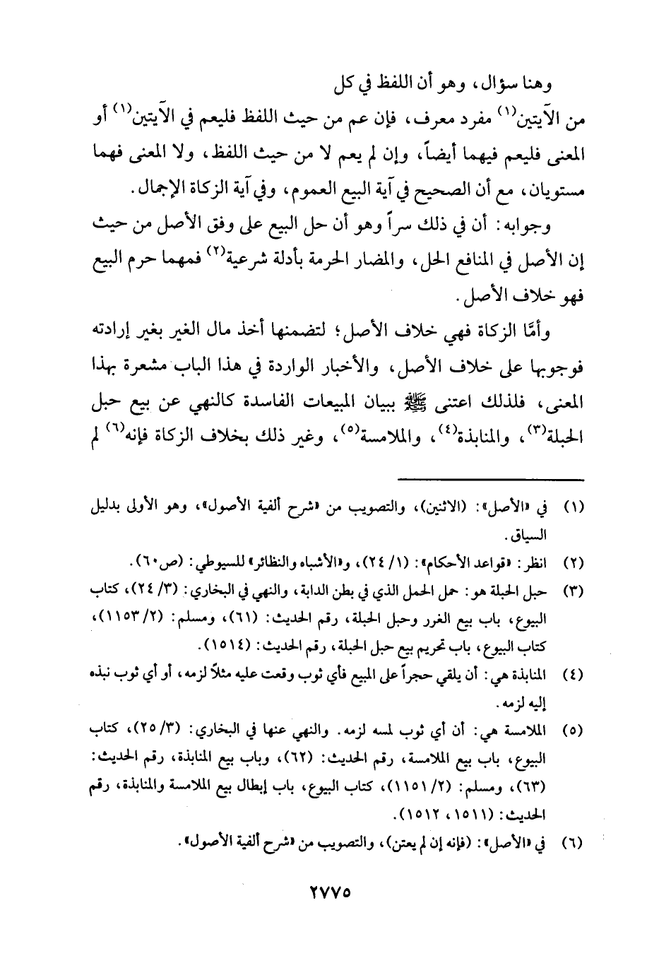 وَهنا سُؤال، وَهُوَ أَن اللَّفْظ فِي كل من الْآيَتَيْنِ مُفْرد معرف، فَإِن عَم من حَيْثُ اللَّفْظ فليعم فِي الْآيَتَيْنِ أَو الْمَعْنى فليعم فيهمَا أَيْضا، وَإِن لم يعم لَا من حَيْثُ اللَّفْظ، وَلَا الْمَعْنى فهما مستويان، مَعَ أَن الصَّحِيح فِي آيَة البيع الْعُمُوم، وَفِي آيَة الزَّكَاة الْإِجْمَال.
