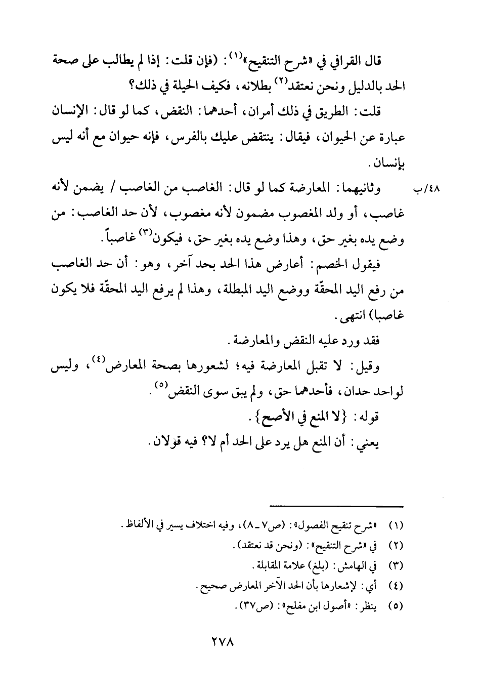 قَالَ الْقَرَافِيّ فِي " شرح التَّنْقِيح ": (فَإِن قلت: إِذا لم يُطَالب على صِحَة الْحَد بِالدَّلِيلِ وَنحن نعتقد بُطْلَانه، فَكيف الْحِيلَة فِي ذَلِك؟