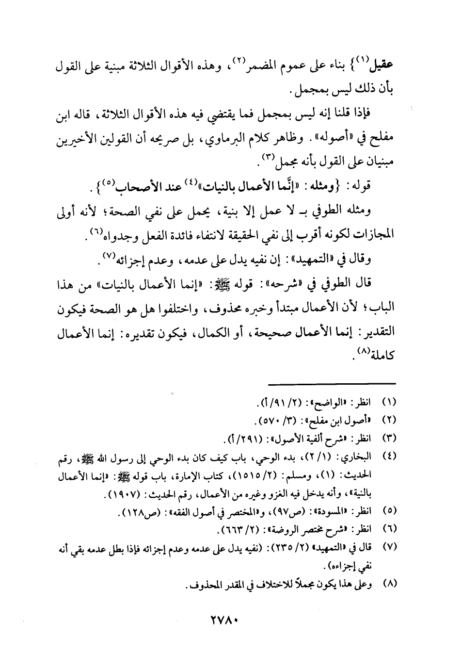 قَالَ الطوفي فِي " شَرحه ": قَوْله - صَلَّى اللَّهُ عَلَيْهِ وَسَلَّم َ -: " إِنَّمَا الْأَعْمَال بِالنِّيَّاتِ " من هَذَا الْبَاب؛ لِأَن الْأَعْمَال مُبْتَدأ وَخَبره مَحْذُوف، وَاخْتلفُوا هَل هُوَ الصِّحَّة فَيكون التَّقْدِير: إِنَّمَا الْأَعْمَال صَحِيحَة، أَو الْكَمَال، فَيكون تَقْدِيره: إِنَّمَا الْأَعْمَال كَامِلَة.