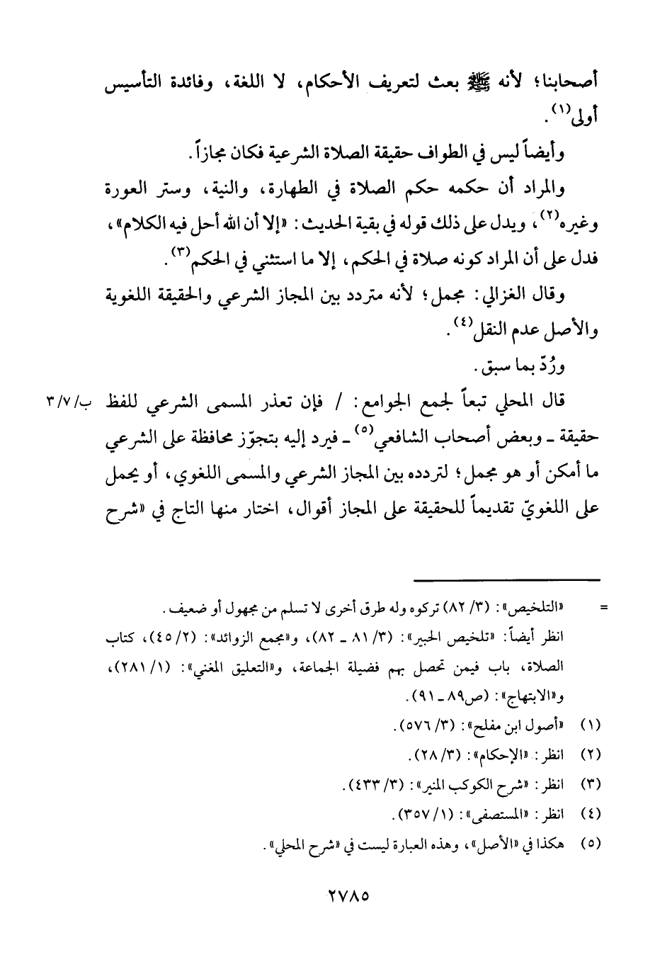 وَقَالَ الْغَزالِيّ: مُجمل؛ لِأَنَّهُ مُتَرَدّد بَين الْمجَاز الشَّرْعِيّ والحقيقة اللُّغَوِيَّة وَالْأَصْل عدم النَّقْل.