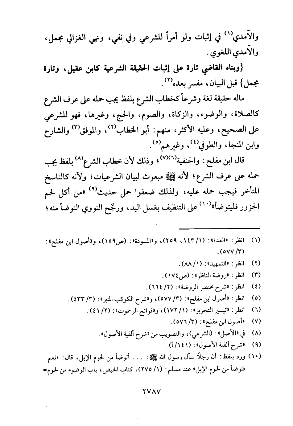 قَالَ ابْن مُفْلِح: وَالْحَنَفِيَّة؛ وَذَلِكَ لِأَن خطاب الشَّرْع بِلَفْظ يجب حمله على عرف الشَّرْع؛ لِأَنَّهُ - صَلَّى اللَّهُ عَلَيْهِ وَسَلَّم َ - مَبْعُوث لبَيَان الشرعيات؛ وَلِأَنَّهُ كالناسخ الْمُتَأَخر فَيجب حمله عَلَيْهِ، وَلذَلِك ضعفوا حمل حَدِيث " من أكل لحم الْجَزُور فَليَتَوَضَّأ " على التَّنْظِيف بِغسْل الْيَد، وَرجح النَّوَوِيّ التوضأ مِنْهُ؛