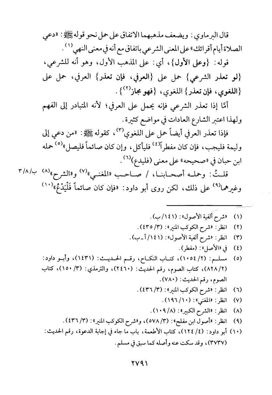 فَإِذا تعذر الْعرفِيّ أَيْضا حمل على اللّغَوِيّ، كَقَوْلِه - صَلَّى اللَّهُ عَلَيْهِ وَسَلَّم َ -: " من دعِي إِلَى وَلِيمَة فليجب، فَإِن كَانَ مُفطرا فَليَأْكُل، وَإِن كَانَ صَائِما فَليصل " حمله ابْن حبَان فِي " صَحِيحه " على معنى (فَليدع) .